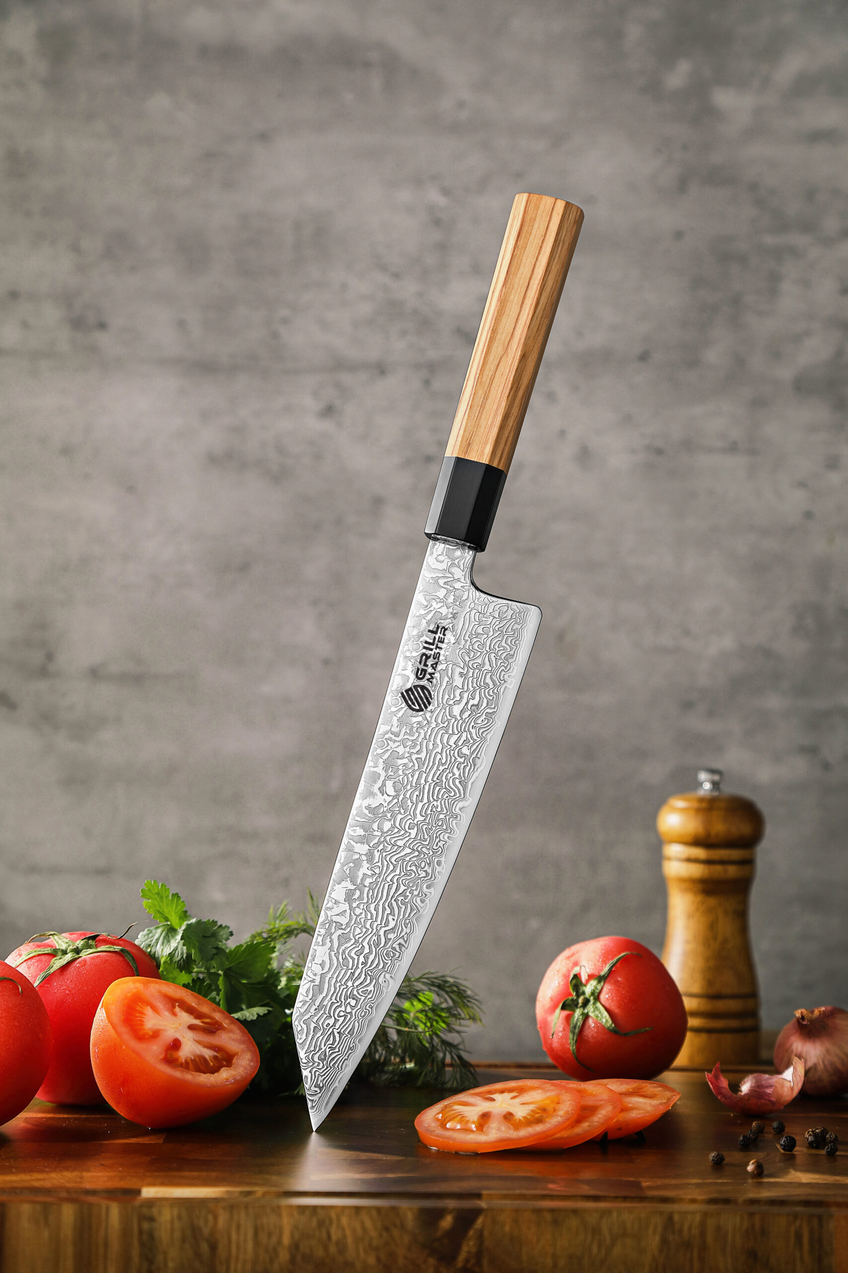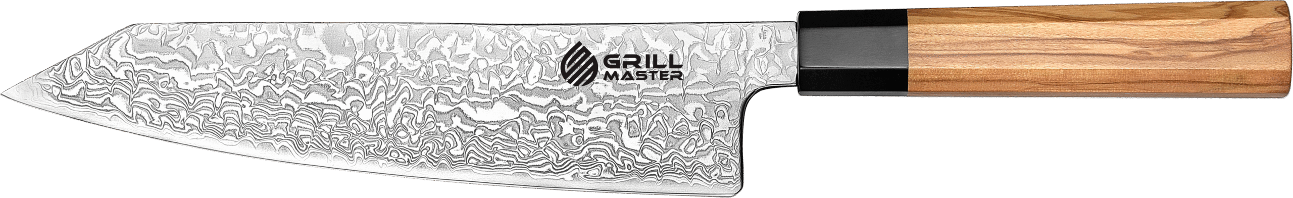 Cuțitul de bucătar GrillMaster GM-PM80 BK este un instrument esențial în orice bucătărie, creat pentru precizie și versatilitate. Lama de 21,5 cm, realizată din 67 straturi de oțel Damascus cu miez 10Cr15CoMoV, oferă un tăiș de neegalat, rezistență excelentă și durabilitate.