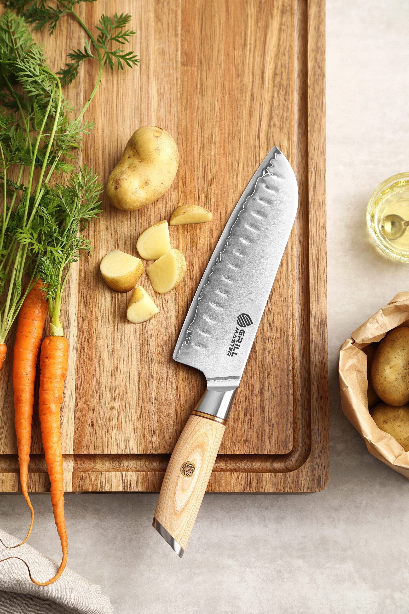 Cuțitul Santoku GrillMaster GM-B37S SK este un cuțit japonez versatil, ideal pentru feliere, tocare și mărunțire. Realizat din 3 straturi de oțel 10Cr15CoMov, cu o duritate de 58–62 HRC, oferă precizie și rezistență pe termen lung. Mânerul din lemn Pakka cu nituri elegante din cupru asigură confort și stil. Livrat într-o cutie cadou premium.